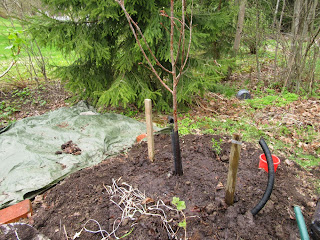 Istuttelin tämän kohopenkkiin, jonka on tehty savimaalle jo muutama vuosi sitten muka hyötyviljelyä varten. Ei siitä hyötyviljelystä mitään tullut, ainakaan siinä penkissä. Joten nyt kuorin sen kummun kaikesta kummasta kasvustosta. Sen ympärillä on hyvin vaarallista aluetta uutuuksia ajatellen. Vuohenputkikasvusto uhkaa, elämänlanka uhkaa. Metsästä viimeistään lehtokotiloarmeija. Joten nyt tämä lähistön alue on väliprojekti tälle kesälle, eli sen siistiminen. Haluan, että puu juurtuu kasvualustaansa, joten kastelua varten asensin tuollaisen putken, jotka pitkin vesi menee suoraan juuristolle. Kiitos Hernepensaskujanteelle tämän esittelystä. Ainakin omenapuille suositellaan istutusvuonna 10 litraa vettä juuristolla kerran viikossa, ellei sada muuten tarpeeksi.