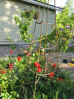 Kurjenpolvi Orion kohosi tänä kesänä myös tuota kärhötukea pitkin (jäi vahingossa kärhötuen keskelle). Orionia kuvasi yhdessä jättipoimunlehden kanssa.