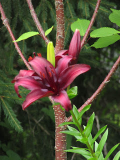 Näiden etappien lisäksi minua on alkanut kiinnostaa monenlaiset näkymät (joita ei siis oikein vielä ole). Ja monenlaiset muutkin kasvit. Jotkut kukkapenkit rakentuvat lähes kuin itsestään sellaisiksi kuin pidän, usein vähän vahingossa. Joidenkin kanssa joudun totisesti miettimään ja pähkäilemään ja silti on vaikea saada mitään järkevää kokonaisuutta aikaiseksi. Tämä kärhö Aljonushka tarvitsee ehdottomasti tuen, se ei kierry itsekseen minkään ympärille, kasvaa vain noin 2 metrin mittaiseksi.