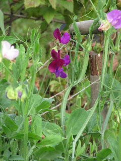 Pihoilla ja puutarhoissa on syksy. Tuoksuherneet jaksavat vielä kukkia. Niille viritetty lapiotuki jäi vähän matalaksi.